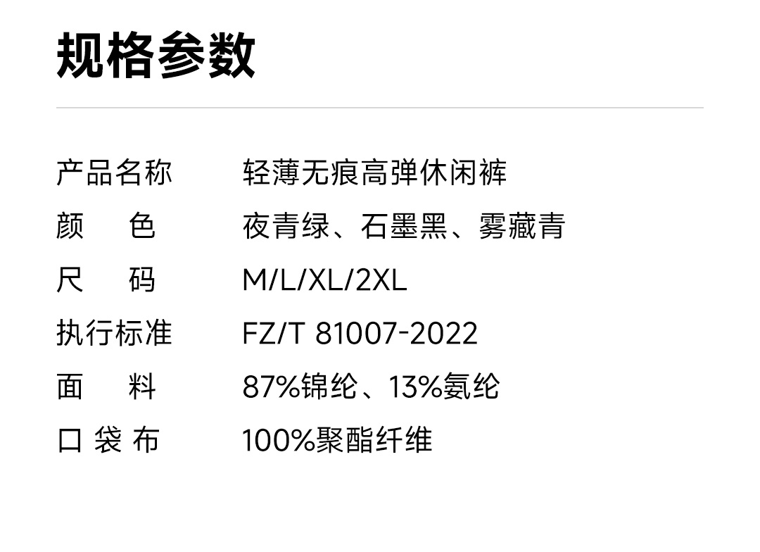 零界纤维 轻薄高弹无痕休闲透气舒适长裤 黑色 M