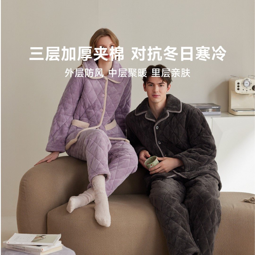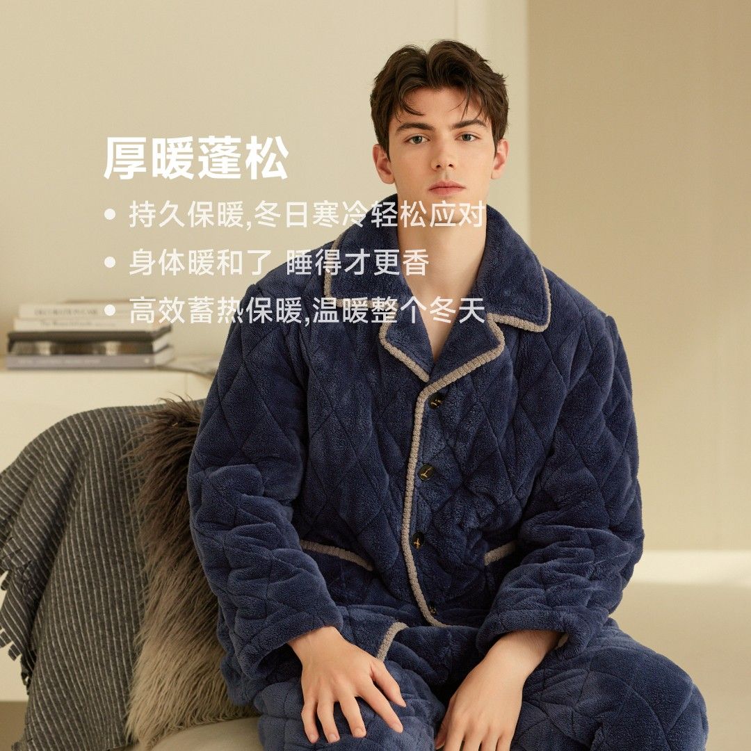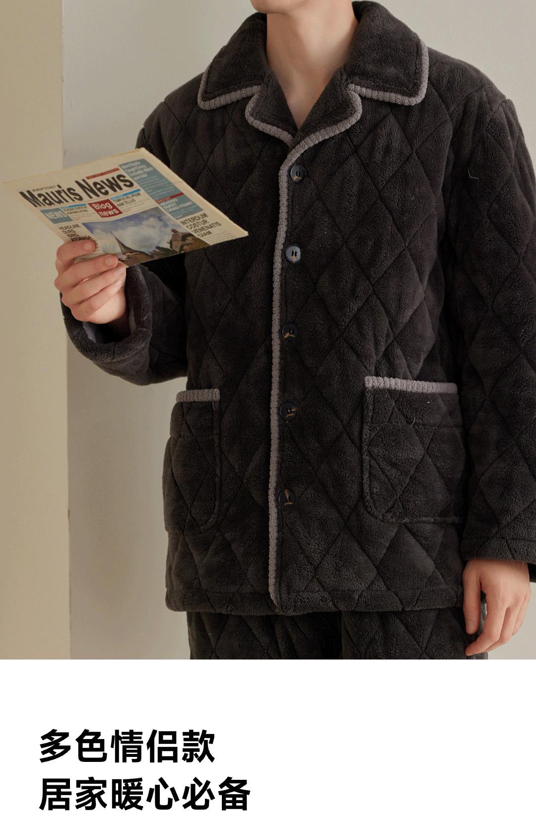 冬季加厚情侣珊瑚绒三层夹棉家居服套装 长袖款 L 碳灰-F0459男款