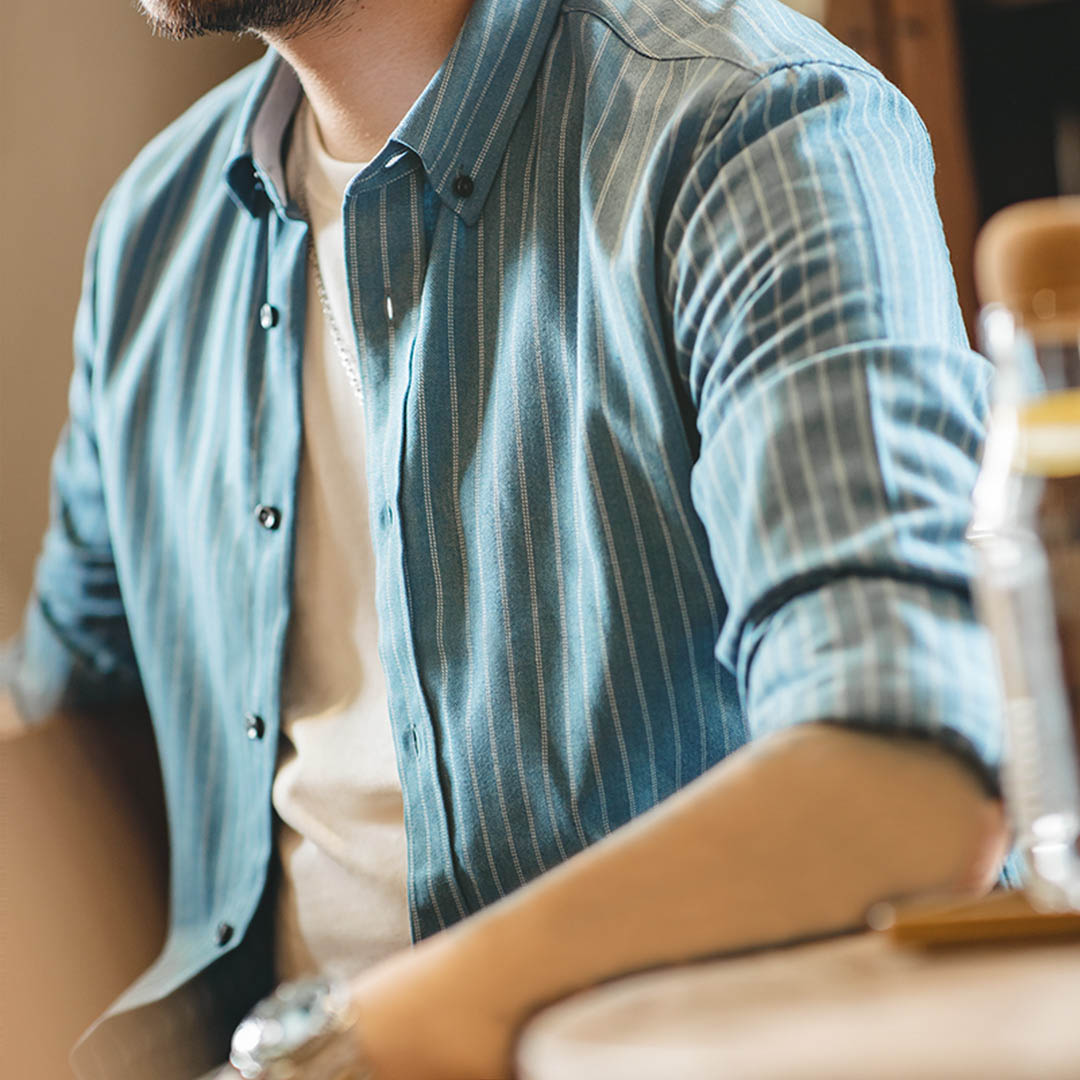 美式复古磨毛阿美咔叽竖条纹长袖衬衫休闲衬...